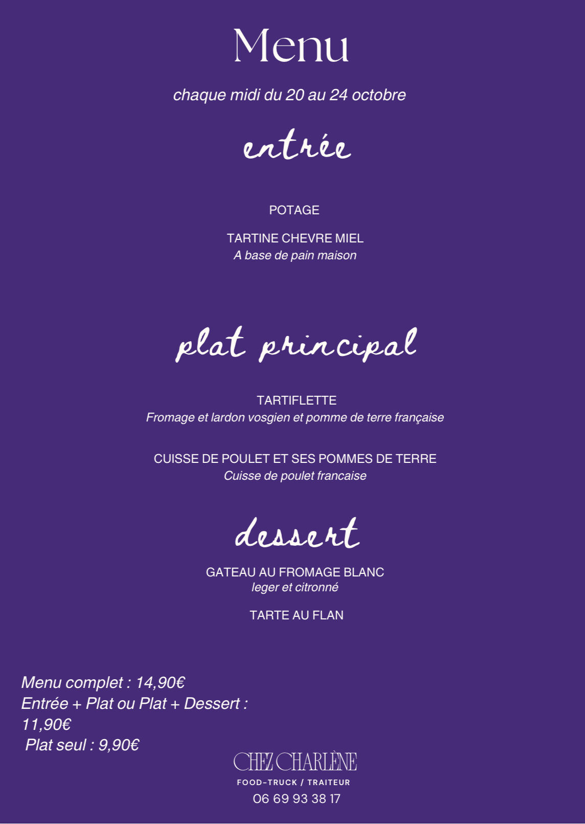 Chaque midi vous pourrez retrouver un menu unique composé d'une entrée, d'un plat et d'un dessert pour 14,90€ !